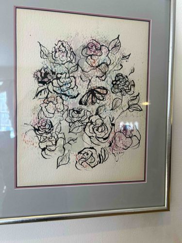 This is a matted and framed modernist work of art featuring a cluster of stylized roses. The medium appears to be black ink line work over a stippled or splattered watercolor background in pastels of pink, lavender, and muted green. The drawing is executed on a textured, cream-colored heavy art paper or cardstock. The composition is loose and expressive, utilizing varied line weights that suggest a mid-to-late 20th-century aesthetic. There is a small, illegible signature or marking in the lower right area of the drawing. Physically, the artwork is housed within a multi-layered presentation consisting of a thin pink inner mat and a wider sage-grey outer mat. The frame is a simple, polished metallic gold-toned moulding, likely aluminum or wood with a metallic finish. Regarding condition, the paper shows slight yellowing consistent with age, but no major foxing or staining is visible. The mats appear well-preserved, though there is a reflection on the glass indicating the presence of standard glazing. The overall craftsmanship suggests a professionally framed piece likely dating from the 1970s or 1980s, reflecting the decorative interior styles of that period.