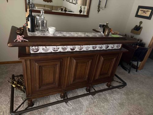 Mid-20th Century German Oak Home Bar with Delft-Style Ceramic Tiles