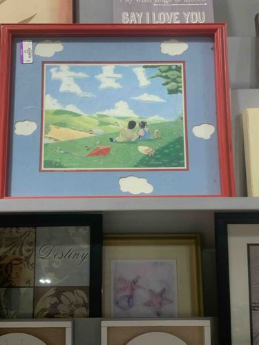 This item is a rectangle-shaped art piece featuring a central rectangular print of a boy and girl sitting on a grassy hilltop looking at rolling hills and a bright blue sky. The print is characterized by a soft, illustrative style typical of children's book art or nostalgic wall decor from the late 20th century. The artwork is set within a custom-designed double mat. The top mat is a solid sky blue color featuring unique cloud-shaped cutouts that allow a white under-mat or paper to show through, creating a 3D sky effect outside the main image. The piece is housed in a vibrant red-painted wooden or composite frame with a simple stepped profile. The entire assembly is covered by a protective glass pane. A small white retail sticker is visible in the upper lefthand corner of the frame. In terms of condition, there are visible scuffs and some paint loss on the red frame's edges, particularly on the right side. The matting appears intact, though the colors show a slight saturation consistent with age. This item likely dates to the 1990s and was intended for a nursery or child's bedroom decoration. No artist signature or maker's marks are clearly visible from the front view.