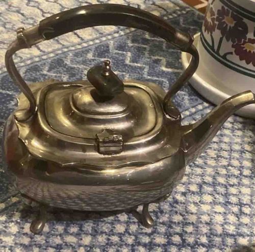 This item is a vintage, silver-plated squat tea kettle or spirit kettle, likely dating from the early to mid-20th century. The kettle features a rounded, compressed body with a broad, stepped shoulder and a flush-fitting hinged lid topped with a dark, finial-style knob. The handle is an fixed overhead arch design, constructed of metal with a central dark heat-insulating grip, possibly made of Bakelite or ebonized wood, secured with decorative silver-toned ferrules. The spout is short and elegantly tapered, emerging from the mid-section of the vessel body. The entire piece is elevated on four small, curved cabriole-style feet that provide stability and thermal clearance from table surfaces. The metal exhibits a significant amount of tarnish and surface oxidation, which is particularly evident in the recesses of the lid and around the handle joints, suggesting the item has not been polished recently. There are visible surface scratches and minor pitting consistent with regular use and age. The craftsmanship reflects a traditional utilitarian elegance with Art Deco or late Victorian influences in the curvature of the feet and the stepped lid design. While no maker's marks are visible in the photograph, they would likely be found on the underside of the base. The overall condition appears fair to good for its age, requiring a thorough cleaning to restore its luster.