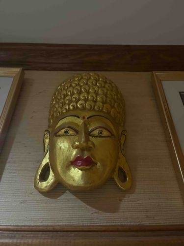 This decorative wall mask depicts the head of the Buddha, characterized by traditional iconographic elements. The mask features a prominent ushnisha (cranial bump) covered in tightly curled, snail-shell-like knobs representing hair. The face is finished in a bright gold or gilded metallic paint, with localized polychrome accents: the lips are painted a vibrant red, and the eyes are outlined in black with distinct pupils. The eyebrows are stylized as long, arched lines, and a small red bindi or urna is visible on the forehead. The ears are highly stylized with elongated lobes, a traditional symbol of wisdom and nobility. The construction appears to be cast, possibly from a composite material, heavy plaster, or carved wood, then finished with a gold-leaf effect or metallic lacquer. The craftsmanship shows moderate detail, with some visible irregularities in the surface texture that suggest hand-finishing. Regarding condition, there are visible signs of wear including small abrasions, scuff marks, and minor paint loss, particularly on the cheeks and nose, revealing a lighter substrate beneath. A slight patina of dust is present in the recessed areas of the hair. This piece is likely a mid-to-late 20th-century decorative export item, possibly from Southeast Asia (such as Thailand or Indonesia), designed for interior wall display.
