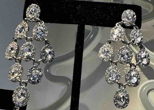 A pair of articulate tiered chandelier-style earrings featuring a silver-tone metal base, likely rhodium or silver-plated brass, consistent with BCBG's fashion jewelry standards. Each earring is composed of multiple oval-shaped links arranged in a descending, multi-tiered chandelier silhouette that offers significant movement. The design centers on eight larger oval medallions, each set with a central faceted oval clear crystal stone surrounded by a halo of smaller round-cut pavé crystals. The metallic construction utilizes small jump rings to connect the tiers, ensuring a fluid drape when worn. The stones are synthetic crystals, designed to mimic high-end diamonds with significant light refraction and brilliance. In terms of condition, the earrings appear to be in good vintage or pre-owned state; the crystals retain their clarity without visible clouding, and the metal finish shows a bright, polished luster with no immediate signs of peeling or heavy oxidation. As part of a contemporary fashion brand collection, these date likely to the early-to-mid 2010s, reflecting a glamorous, red-carpet-inspired aesthetic. The craftsmanship is high for costume jewelry, with secure settings and a symmetrical layout.