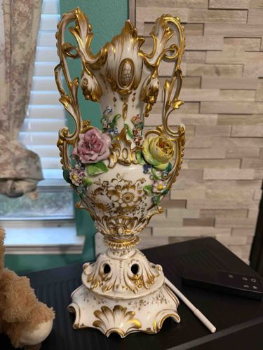 This is a highly ornate ceramic vase, potentially of German or French origin, featuring a Rococo Revival aesthetic. The item is constructed from fine white porcelain and stands on a pedestal base with scrolling edges. Its most prominent features are the high-relief, hand-applied ceramic floral encrustations, colloquially known as 'Schneeballen' or snowballs, including large pink and yellow roses with green leaves. The vase is further embellished with extensive 24k gold gilt accents highlighting the scalloped rim, pierced scrolling handles, and the bulbous body. The body exhibits delicate hand-painted floral motifs and gilded foliate patterns. Structurally, the vase consists of three distinct parts: a flared, asymmetrical mouth, an oviform body, and a tiered pedestal. Visible condition issues include minor loss to the delicate petal tips and some rubbing to the gilt on high-contact points, which is common for its estimated age (late 19th to early 20th century). The craftsmanship is characteristic of high-end porcelain houses such as Meissen, Dresden, or Sitzendorf, though a specific maker's mark would be required for confirmation. Its elaborate, theatrical design indicates it was intended as a decorative mantle piece during the Victorian era.