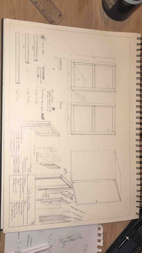 This item is an original, hand-drawn technical architectural sketch on a large format spiral-bound sketchbook page. The drawing features a detailed set of plans, elevations, and perspective views for a piece of cabinetry or furniture, possibly a built-in wardrobe or shelving unit. The medium appears to be fine-point graphite or archival ink on off-white or cream-colored heavyweight artist paper. The sketch includes precise drafting lines, measurement callouts, and handwritten annotations detailing material components such as wood types and hardware. Characteristic of contemporary professional design work, the page shows multiple perspectives: a front elevation, a plan view, and an exploded isometric detail showing internal construction such as drawers and partitions. The condition appears excellent with clean edges, no visible foxing, and sharp contrast in the line work, though slight shadowing from the spiral binding is present. The craftsmanship level suggests a trained designer or architect, showcasing high-level spatial planning and drafting skills. The paper size is approximately 11x14 or 12x18 inches based on the scale of the surrounding objects like the ruler and pen.