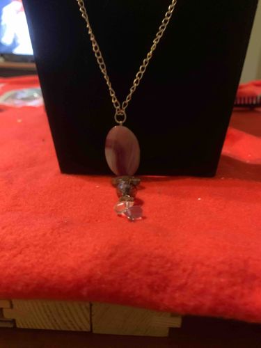 This contemporary costume jewelry necklace features a mixed-media pendant suspended from a gold-toned chain. The focal point is a large, polished oval flat-bead, likely banded agate or a similar semi-precious stone, showcasing natural swirled patterns in shades of dusty rose, mauve, and cream. Below the primary stone hangs a vertical drop composed of several smaller beads, including faceted glass or crystal spacers in smoky and clear tones, and a metallic bronze-toned rondelle. The necklace is constructed with base metal components featuring a bright yellow gold-colored finish. The chain is an oval link style, commonly referred to as a cable or trace chain. Overall, the piece appears to be in good used condition with no visible chips to the stones or significant tarnishing on the visible portions of the metal. The construction is typical of mass-produced fashion jewelry from the late 20th or early 21st century. It lacks discernible maker's marks on the front surface, suggesting it may be a boutique or craft-produced item rather than a high-end designer piece. The variety of textures—from the smooth, matte-like finish of the agate to the reflective faceted surfaces of the lower beads—provides balanced visual interest.