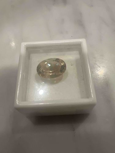 This item is an oval modified brilliant cut loose gemstone, exhibiting a pale champagne or light smoky citrine hue. The stone is estimated to be approximately 8 to 12 carats based on its scale within the standard white plastic gemstone display box. The gemstone features professional faceting with a large table and numerous crown facets that enhance its light dispersion and internal brilliance. Its color is consistent across the pavilion, showing good saturation without significant zoning. Under magnification, the clarity appears eye-clean, though a microscopic analysis would be required to rule out internal inclusions. The cutting shows high-quality craftsmanship with symmetrical facet meets and a polished finish that provides a vitreous luster. There are no visible chips, abrasions, or surface scratches on the table or girdle, suggesting the stone is in excellent condition. This style of facet cut is typical of contemporary lapidary work from the late 20th to early 21st century. The gemstone is presented in a white square glass-topped acrylic jar, a common storage and display method used by gem dealers to protect the stone from physical impact while allowing for easy inspection of the color and cut.