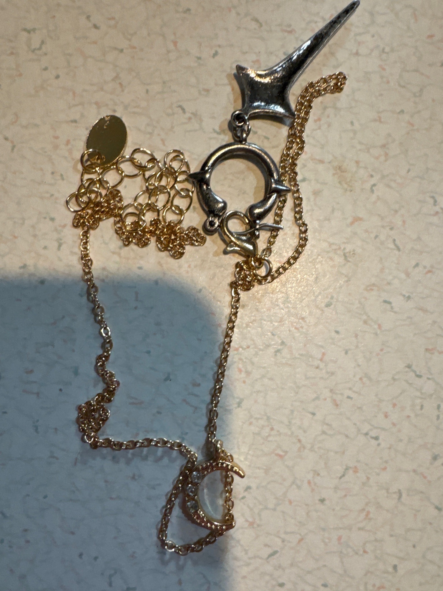 This piece is a contemporary fashion necklace featuring a multi-pendant design with mixed metal finishes in gold, silver, and gunmetal tones. The necklace consists of a gold-toned curb-style chain that displays a crescent moon pendant bottom-center, encrusted with small clear rhinestones or crystals. Moving up the chain, there is a prominent gunmetal-toned ring fastener that serves as a decorative link, connecting to a silver-toned, stylized dagger or blade-shaped charm with a tapering point and a flared base. The secondary gold chain features an adjustable length extension and a small circular metal tag near the lobster claw clasp, though no specific brand engravings are legible in the provided view. The construction appears to be machine-made costume jewelry using base metals and plating rather than high-karat gold or sterling silver. Condition-wise, the piece shows visible surface wear, including some dulling of the finish on the silver dagger and tangling of the finer chain segments. The style reflects a modern 'gothic-bohemian' aesthetic likely produced within the last 5-10 years, typical of mass-market retailers or independent boutique accessory brands.