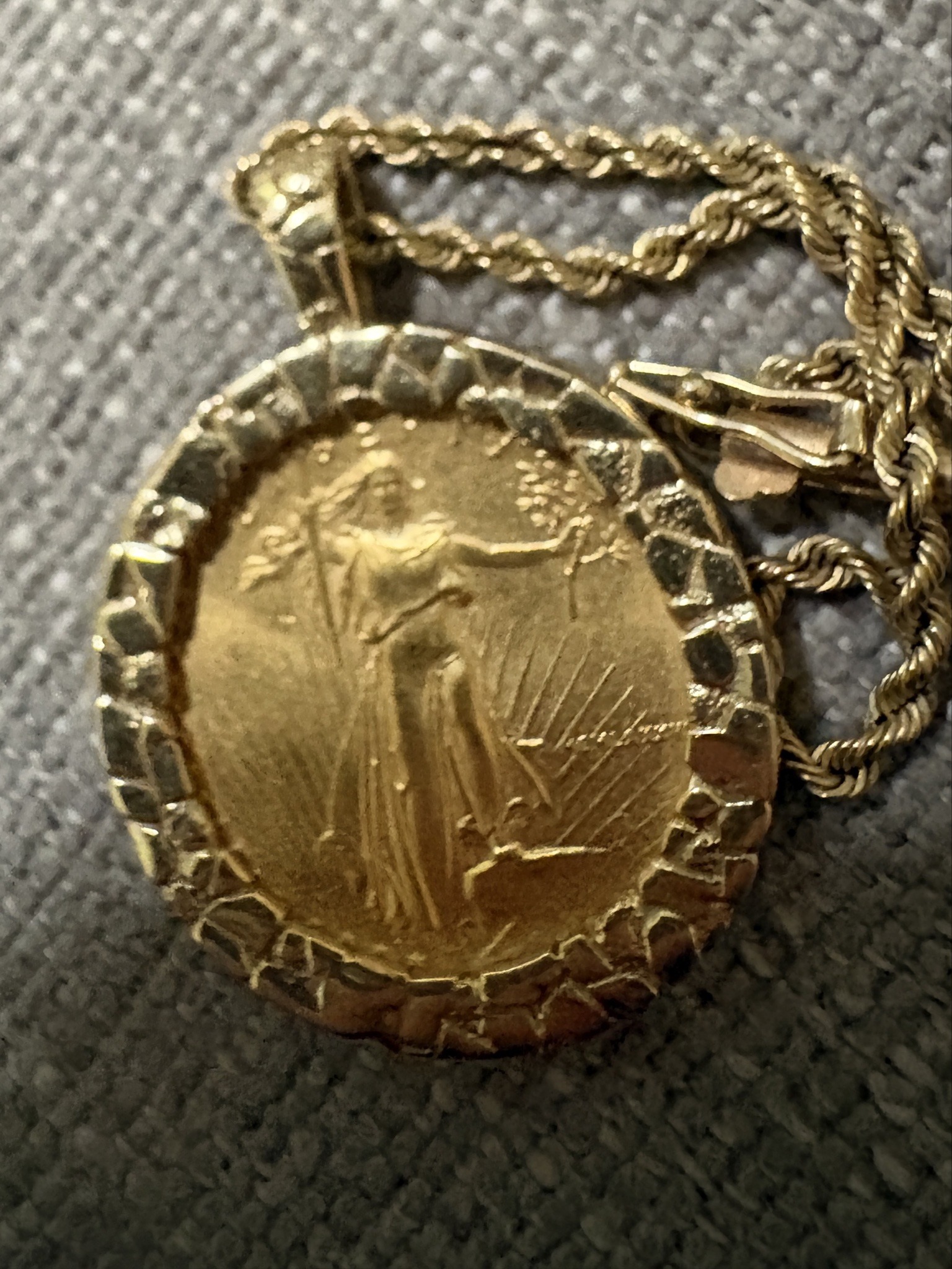 This item consists of a United States Mint American Gold Eagle coin mounted in an ornate, circular jewelry bezel attached to a matching gold rope chain. The coin features the iconic Augustus Saint-Gaudens design, depicting Lady Liberty striding forward with a torch in her right hand and an olive branch in her left, set against a background of the Capitol building and sun rays. The gold exhibits a high-carat yellow hue, typical of .9167 (22-karat) gold fineness found in modern Bullion American Eagles. The bezel is textured with a geometric 'nugget' or faceted style, designed to catch and reflect light, providing a wider profile to the pendant. The coin shows signs of circular wear and minor abrasions consistent with its use as jewelry rather than a numismatic specimen. The overall condition reveals a soft patina and light surface scratches on the high points of the relief. Based on the design, the coin was originally minted post-1986. The assembly is suspended from a classic twisted rope chain with a lobster or barrel-style clasp. The craftsmanship of the bezel suggests late 20th-century commercial jewelry manufacturing. There are no visible hallmark stamps in the photograph, though they would typically be found on the chain's clasp or the pendant's bail (loop).