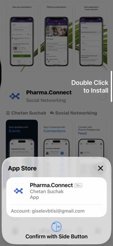This item is a digital mobile application interface for 'Pharma.Connect', developed by Chetan Suchak, as seen on the Apple iOS App Store. The interface displays a contemporary flat design aesthetic characteristic of mid-to-late 2020s mobile software. Visually, the UI utilizes a crisp white and blue color palette with deep purple accents in the app's internal dashboard headers. The application logo features a blue, stylized DNA-helix or infinity-style knot. The screenshot captures the 'Install' prompt on an iPhone, showcasing the standard iOS rounded modal window with the 'App Store' label and an '18+' age rating badge. Notable features depicted in the background screenshots include modules for prescription management, refill reminders, and social networking feeds for medical professionals. The typography is a clean, sans-serif font optimized for legibility. The interface is in pristine digital condition, exhibiting high-resolution rendering and alignment with Apple's Human Interface Guidelines. The 'Double Click to Install' and 'Confirm with Side Button' overlays indicate it is running on a modern FaceID-compatible hardware generation. This software serves as a bridge between patient pharmaceutical needs and professional social networking.