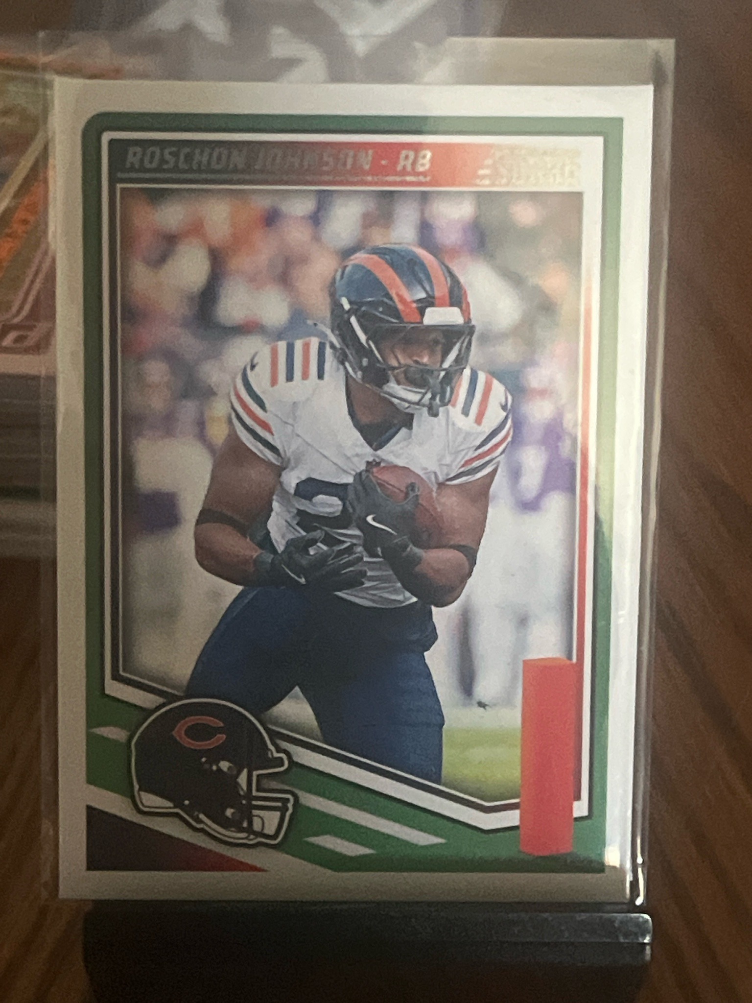 This is a 2023 Roschon Johnson rookie-year football trading card from the Panini Score collection. The card measures approximately 2.5 by 3.5 inches and is constructed from standard cardstock with a semi-gloss finish. The front depicts Johnson, a running back for the Chicago Bears, in an action sequence carrying a football. He is wearing his white away jersey with navy and orange accents, blue pants, and a navy helmet. The card's design features a distinctive green border, which identifies it as a specific parallel variant of the base set. Top-left corner text reads 'ROSCHON JOHNSON - RB', and the Chicago Bears helmet logo is located at the bottom left. The Panini 'Score' brand logo is visible in the upper right corner. The condition appears excellent as the card is currently held in a clear plastic protective sleeve, which has preserved the sharpness of the corners and edges. There are no visible surface scratches, creases, or fading to the inks. The centering appears slightly heavy toward the right side. This modern sports card is part of the 2023 release cycle, marking the player's entrance into the NFL.