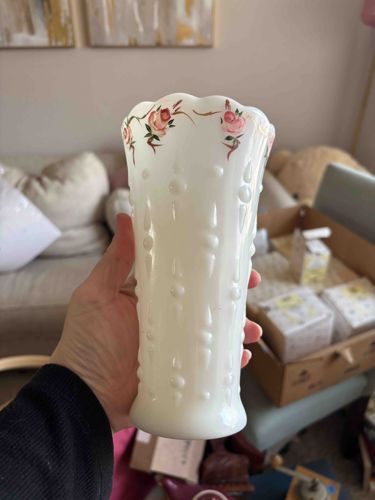Fenton Milk Glass Hobnail and Bead Hand-Painted Rose Vase