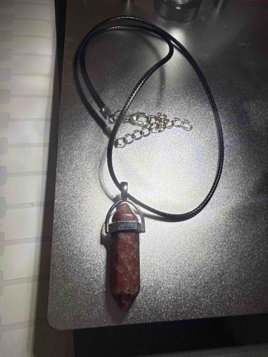 This item is a fashion gemstone necklace featuring a pendant made from red aventurine or reddish-brown jasper. The stone is carved into a faceted, hexagonal double-terminated 'bullet' or 'wand' shape, measuring approximately 1.5 inches in length. It is held by a simple, silver-toned metal bail (likely a zinc alloy or base metal) that wraps around the upper neck of the stone. The pendant is suspended from a black cord, which appears to be waxed polyester or synthetic leather, approximately 18 inches in length. The cord is secured with metal crimp ends and a standard lobster claw clasp, accompanied by a small length of silver-toned extender chain for adjustable sizing. Physically, the stone exhibits a mottled, earthy red color with subtle internal flecks and variations characteristic of natural quartz-based minerals. The craftsmanship is utilitarian, common for mass-produced 'crystal healing' jewelry of the modern era (circa 2010-present). The condition appears to be excellent and unworn, showing no visible chips in the stone or oxidation on the metal components. There are no identifiable maker's marks or stamps, indicating this is a white-label or generic commercial product. The overall style is contemporary and bohemian-inspired, often associated with metaphysical or spiritualist accessories.