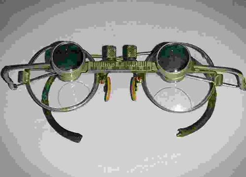 This is a vintage optical trial lens frame, an ophthalmic instrument typically used by optometrists and ophthalmologists during eye examinations to determine a patient's corrective lens prescription. It is constructed from a combination of metal (likely brass and steel) and features intricate adjustment mechanisms. The frame includes two circular lens holders designed to hold various loose trial lenses, with integrated flip-down or secondary magnifying cylinders. A notable feature is the horizontal bridge marked with a millimeter scale (Pupillary Distance ruler) and two large knurled adjustment knobs at the top center for fine-tuning the distance between the lenses. The temples are designed with wrap-around 'cable' ear pieces, a common feature in early to mid-20th-century eyewear to ensure a secure fit. The metal shows significant signs of age, including a greenish oxidation or verdigris patina, surface grime, and wear to the original plating. The nose pads appear to be made of an early plastic or celluloid and show discoloration. This piece likely dates from the early to mid-20th century (circa 1920s-1950s) and reflects the high-quality mechanical craftsmanship and industrial aesthetic of the period, though it currently requires restoration for cosmetic or professional use.
