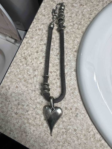 This is a contemporary fashion necklace featuring a thick, tubular metal mesh cord in an oxidized or gunmetal silver tone. The cord is approximately 6mm to 8mm in diameter, constructed from a fine interwoven metallic mesh that provides both flexibility and a textured industrial aesthetic. The focal point is a large, elongated puffy heart pendant with a smooth, polished silver-tone finish. The heart's design is asymmetrical, tapering into a sharp stylized point at the bottom, suggesting a late 20th-century or early 2000s 'Modernist' or 'Edgy' style. The necklace is accented with several sliding ring spacers on either side of the cord, which add visual interest and a sense of movement. The piece utilizes a lobster claw clasp with a short extender chain, allowing for adjustable length. Condition appears fair to good; there is visible surface wear and minor scratching on the pendant's polished surface, and the mesh cord shows some unevenness in the weave near the pendant bail. The metal is likely a base metal alloy with a silver-colored plating rather than solid sterling silver, based on the color consistency and construction style typical of bridge or costume jewelry.