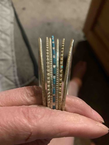 This item is a multi-strand bangle bracelet set, likely composed of an alloy metal with various decorative finishes. The set consists of approximately seven to eight individual thin bangles that are joined or worn together as a tiered stack. The physical characteristics include a mix of gold-tone and silver-tone plating, with one prominent central band featuring a teal or turquoise enamel inlay. The textures vary across the strands: some exhibit a 'stardust' or sandblasted glitter finish, while others feature machine-cut geometric patterns, milgrain-style beading, and small inset rhinestones or glass crystals that provide a subtle 'sparkle' effect. The construction appears to be costume jewelry from the late 20th or early 21st century, consistent with mass-produced contemporary fashion accessories. Regarding condition, there is visible wear to the plating, particularly on the outer edges where the base metal appears to be showing through, a common issue with gold-flashed costume pieces. No specific maker's marks are visible in the provided image. The overall craftsmanship is commercial-grade, designed for aesthetic layering rather than fine jewelry utility. The variety in width and texture suggests a bohemian or eclectic style, intended to create movement and sound when worn on the wrist.