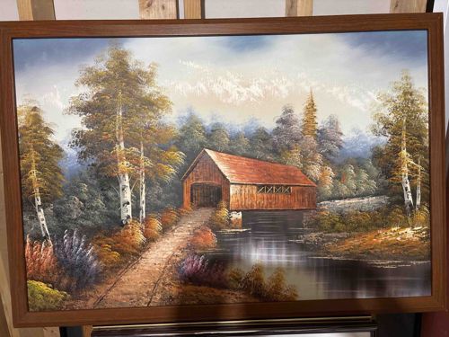 Autumn Landscape Painting of a Covered Bridge Signed by Pffer