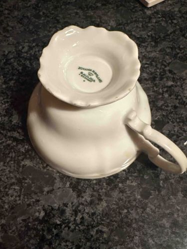 This is a vintage fine porcelain tea cup produced by the renowned Johann Haviland factory in Bavaria, Germany. The piece is crafted from a high-quality white translucent porcelain with a smooth, glossy glaze finish. A notable physical characteristic is the elegant, scalloped or ruffled footring, which adds a decorative flare to the inverted base. The body of the cup appears to have a subtle fluted or gadrooned texture, leading to a gracefully looped and molded handle with architectural details where it joins the body. The underside bears a clear green backstamp reading 'JOHANN HAVILAND' over a crown insignia, with 'BAVARIA GERMANY' specifically designated below, a mark style typically associated with the mid-20th century (circa 1940s-1960s). This particular piece appears to be part of the 'Blue Garland' or a similar classic white relief pattern. Condition-wise, the porcelain shows a slight yellowish stain or residue near the handle attachment point and some darkening on the unglazed rim of the foot, which is common with age. There are no immediate signs of large chips or cracks visible in this view, though the textured edges of the footring require close inspection for micro-flea bites. The craftsmanship is indicative of German precision ceramics from the Waldershof region.
