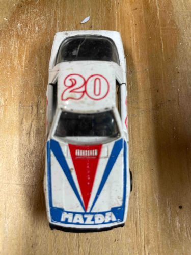 This is a vintage Hot Wheels 1:64 scale die-cast model of a first-generation Mazda RX-7 (SA22C/FB). The vehicle features a white base paint with a prominent racing livery consisting of blue and red stripes. On the hood, the word 'MAZDA' is printed in blue, and on the roof, there is a large racing number '20' outlined in red. The item is constructed from a die-cast metal body with a plastic chassis and interior. Notable features include wide-set fenders and a tinted black plastic windshield. The condition shows significant signs of play-wear and aging suitable for a vintage toy; there are multiple paint chips and abrasions scattered across the hood, roof, and edges. Surface grime and a yellowish patina are visible on the white paint. The windshield appears to have minor surface scratches or a potential hairline crack. Based on the casting and livery style, this model likely dates from the early-to-mid 1980s. While it lacks its original packaging, it remains a recognizable example of early Hot Wheels imports, characterized by simple but durable construction and period-correct racing aesthetics.