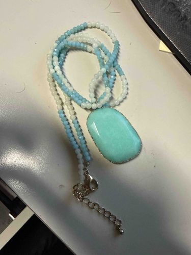 This is a contemporary fashion necklace featuring a triple-strand beaded chain and a large focal pendant. The strand utilizes alternating sections of light sky-blue faceted glass beads and opaque white round beads, which are approximately 4mm in diameter. The pendant is an oversized, irregularly shaped rectangular stone or resin composite with a polished, vibrant mint-green/turquoise hue. It is encased in a simple, silver-toned scalloped or textured decorative bezel. The necklace measures approximately 18 to 20 inches in length and is secured by a silver-finish base metal lobster claw clasp. A matching extender chain of roughly 2 inches is attached, allowing for adjustable wear. The beads appear to be strung on a durable monofilament or jewelry wire. The condition is excellent with no visible chips to the beads, though there is a slight patina building on the metal components. This piece represents a bohemian or casual 'statement' jewelry style common in the early 21st century. The craftsmanship is typical of mass-produced boutique accessories, focused on visual impact and color harmony rather than high-end metallurgy or genuine gemstone settings.
