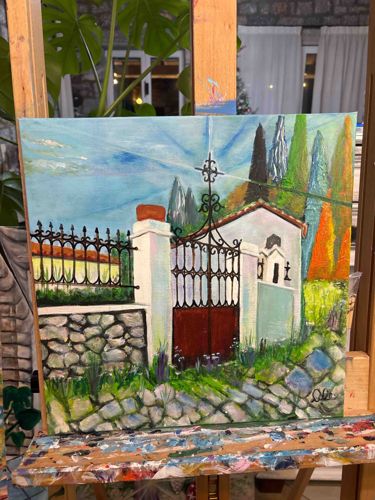 This original painting, attributed to Dale Haessly, is an expressive representation of a Mediterranean or European courtyard entrance. Executed in what appears to be acrylic or oil on a square canvas, the composition features a prominent wrought-iron gate set between white stucco pillars and a cobblestone path. The color palette is vibrant, utilizing a range of cerulean blues for the sky, ochre and sienna for the rooftops, and varied greens for the tall cypress trees and foreground vegetation. The craftsmanship is characterized by a folk-art or post-impressionist style, with visible brushstrokes and a slightly naive perspective. Notable features include the intricate scrollwork of the iron gate and the textural rendering of the stone wall. The piece is signed 'Dale' in the bottom right corner in black script. The canvas appears to be in good contemporary condition, currently resting on a wooden studio easel, indicating it may be a recent work. There are no immediate signs of cracking (craquelure) or pigment loss visible in the image. The overall quality suggests a dedicated contemporary artist with a focus on light and architectural charm.