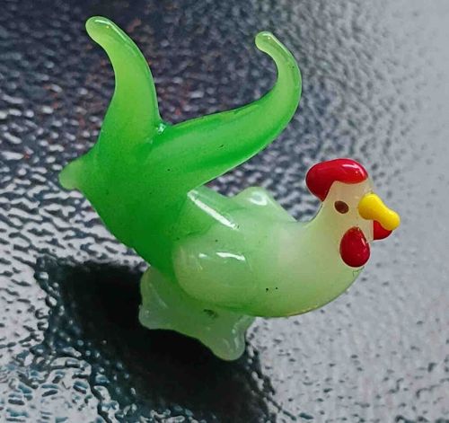 This item is a micro-miniature figurine of a rooster, meticulously crafted using the lampwork glass technique. The piece is constructed from translucent and opaque glass in a vibrant palette of emerald green, pale lime, red, and yellow. The body features a gradient effect, transitioning from a milky pale green at the breast to a deep, saturated green throughout the prominent, upright tail feathers. Notable physical features include a trio of stylized tail plumes curved backwards, a bright red comb and wattle, a tiny yellow beak, and dark dot eyes. The figurine stands approximately 1 to 1.5 inches in height. The craftsmanship suggests it was created by heating glass rods over a torch (lampworking) and hand-shaping the molten material without the use of molds, making each iteration slightly unique. In terms of condition, the glass appears to be in excellent vintage state with no visible fractures, chips, or internal stress cracks. There are no discernible maker's marks or signatures, which is common for such small-scale art glass. Based on the style and material, this piece likely originates from the mid-to-late 20th century, consistent with collectible glass miniatures popularized by studios in Murano, Italy, or similar artisan workshops in Asia. The fluid curves and delicate balance of the tail assembly indicate a high level of artisanal skill for its scale.