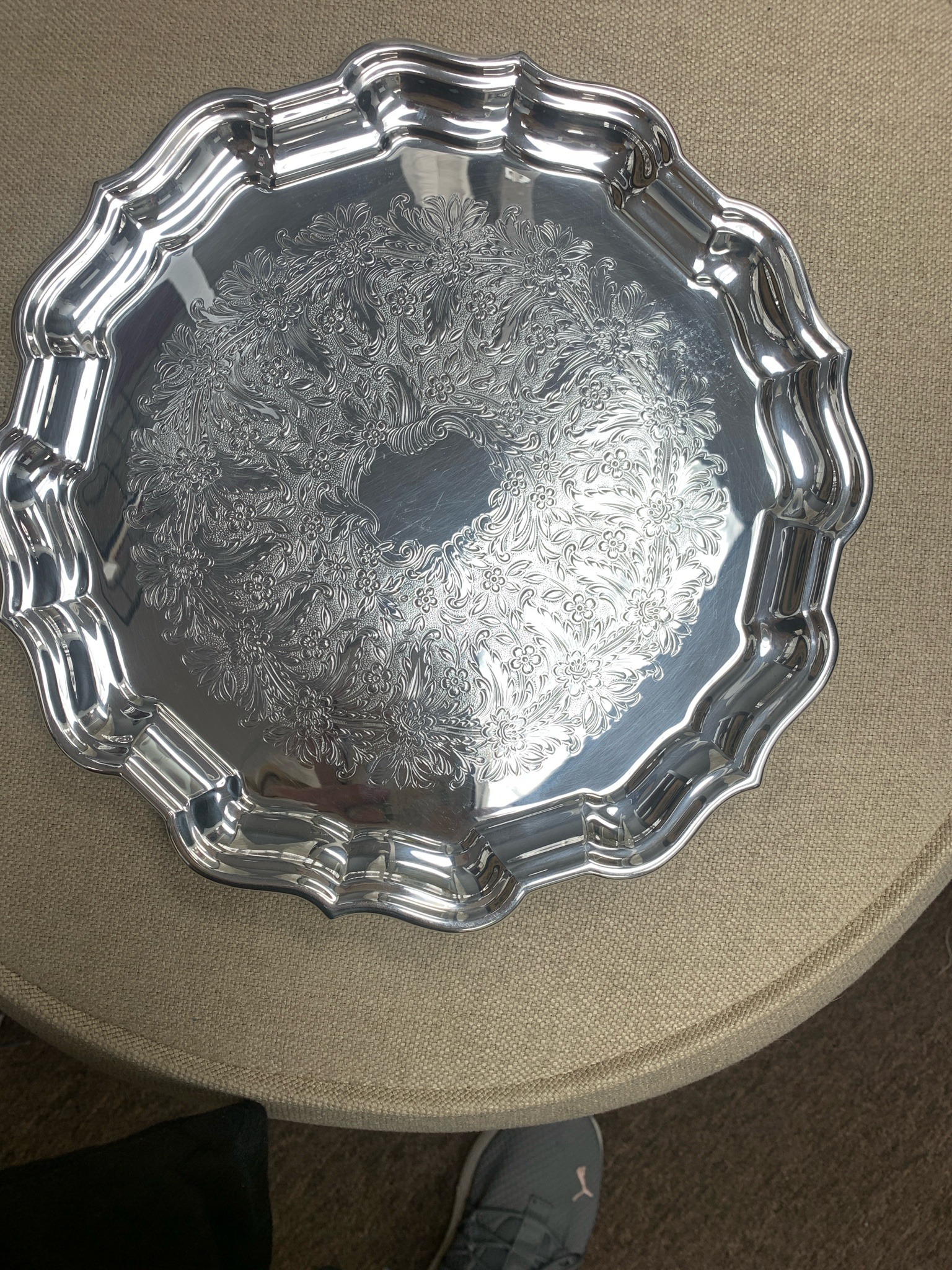 This is a circular waiter or service tray manufactured by Reed & Barton in their classic 'Chippendale' pattern (identified by number 57). The tray is constructed from silver-plated base metal, exhibiting a highly reflective, polished finish. Its primary design feature is a deep, multi-lobed 'scalloped' rim with stepped molding that creates a rhythmic, undulating border characteristic of the 18th-century Chippendale style. The central well of the tray features an elaborate circular band of chased or etched floral ornamentation, consisting of scrolling vines, leaves, and various blossoms, leaving an unadorned circular center for a possible monogram (though this example is currently blank). The tray appears to be in very good vintage condition with a bright luster. Upon close inspection, there are light surface scratches and 'swirls' consistent with gentle cleaning and use. There are no immediate signs of 'bleeding' (where the copper or nickel base metal shows through the silver), which suggests the plating remains thick and intact. The craftsmanship is of high quality, typical of mid-20th-century Reed & Barton production. Based on the style and typical markings of this line, it likely dates to the mid-to-late 20th century.