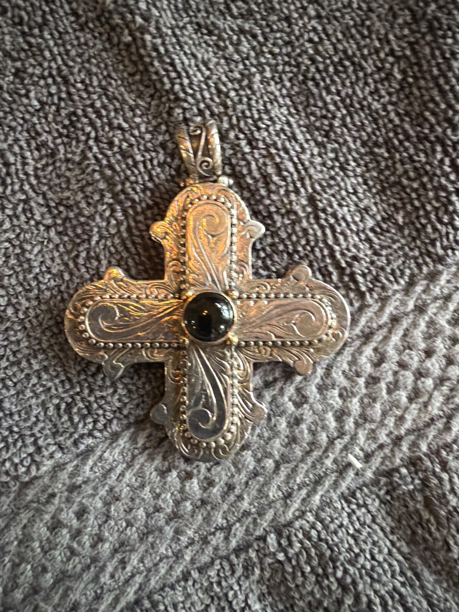 This is a luxury cross pendant from the 'Hebe' collection by the renowned designer Konstantino. The piece is expertly crafted in 925 sterling silver, featuring the brand's signature intricate Byzantine-inspired scrollwork and hand-etched engravings across the four arms of the cross. At the center is a cabochon-cut black onyx gemstone, bezel-set with 18-karat yellow gold accents that provide a rich contrast to the silver metal. The cross is bordered by a meticulous beaded or caviar-style frame, adding textural depth. The bale at the top is also heavily decorated with complementary scrolling motifs, ensuring it can accommodate a variety of chain sizes. Based on the craftsmanship, this is a modern high-end jewelry piece, likely produced within the early 2000s to the present. The condition appears to be very good with a natural light patina in the recessed areas, which enhances the visibility of the engraving. There are no visible chips to the central stone or significant scratches to the metalwork. The piece exemplifies Greek artisan craftsmanship, blending ancient motifs with modern luxury appeal.