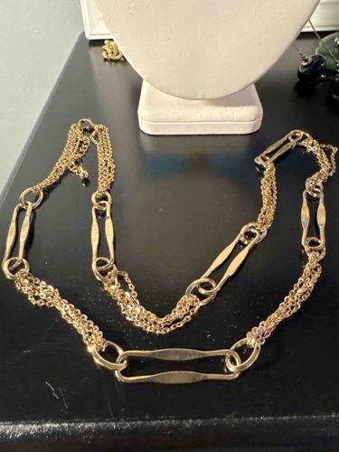 This is a contemporary fashion necklace featuring a gold-tone finish and a distinctive mixed-link design. The construction alternates between large, elongated, double-bar station links and sections consisting of three delicate, fine-gauge cable chains clustered together. The metal appears to be a plated base metal, exhibiting a high-polish yellow gold sheen. The large station links are approximately 2 inches in length and feature a unique pinched or hourglass silhouette, connected by circular jump rings. The necklace is designed as a long, continuous opera or rope length strand, allowing it to be worn long or potentially doubled. Condition-wise, the plating appears largely intact with minor surface scratches and faint signs of oxidation typical of vintage or pre-owned costume jewelry. There are no obvious broken links, though the multi-strand sections show slight tangling which is common for this style. The clasp mechanism is a lobster claw style attached to an extender chain, suggesting a manufacturing date from the late 20th century to modern era. The craftsmanship is consistent with moderate-quality boutique fashion jewelry, prioritizing visual impact and lightweight wearability.