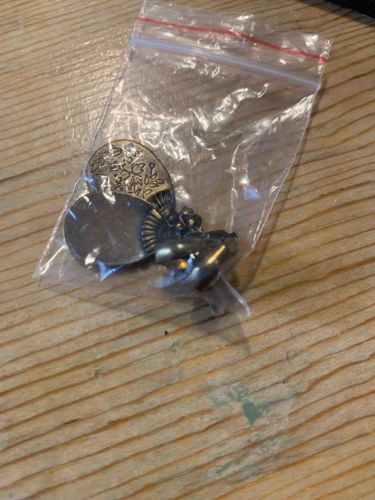 This item is a small decorative pin or brooch fashioned from a dark, antiqued metal alloy, likely brass or bronze-toned pot metal. The design features three overlapping Japanese-style folding fans (sensu). The uppermost fan is ornately detailed with a raised floral and foliate pattern, while the lower fans appear smoother, suggesting a layered, dimensional construction. The metal exhibits a dark patina with golden highlights on the raised relief, indicative of either aged brass or a deliberate antiqued finish. The item is currently housed in a small, clear polyethylene zip-top bag. A metallic clutch backing (butterfly clutch) is visible, used for securing the pin to a garment. The craftsmanship shows cast metalwork with fine-line detailing on the ribs and leaf of the fans, characteristic of mid-20th-century costume jewelry or modern vintage-reproduction accessories. Condition appears to be good with no visible broken components or significant oxidation beyond the intended patina. The style draws from East Asian aesthetic movements, likely dating from the late 20th century to the present as a collectible novelty item.
