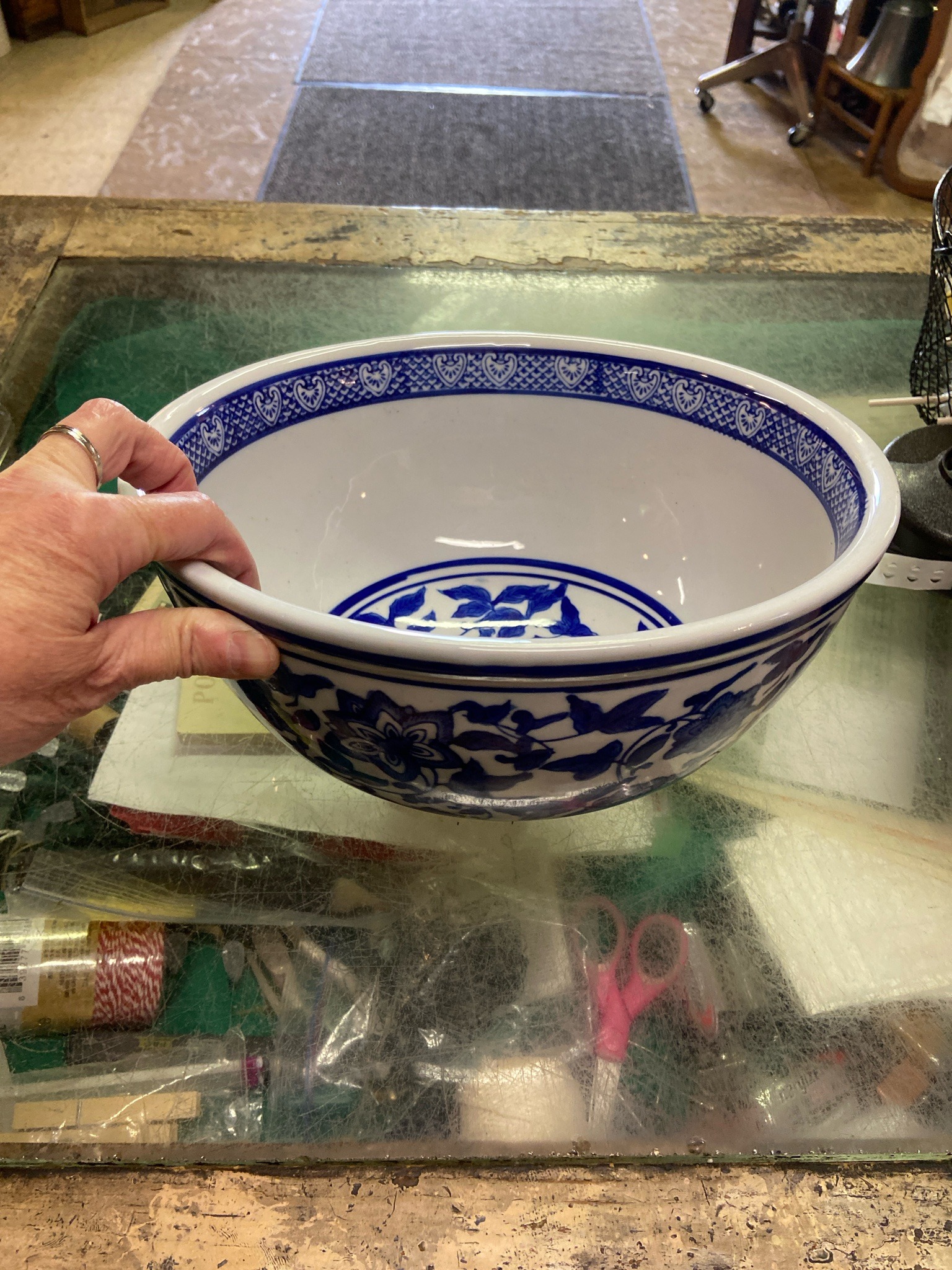This is a large, deep porcelain bowl featuring a classic blue and white Chinoiserie aesthetic. The piece is constructed from a heavy white ceramic, likely a high-fired porcelain or dense stoneware, finished with a smooth clear glaze. It measures approximately 10 to 12 inches in diameter. The interior rim is decorated with a repeating geometric and heart-shaped trellis border in cobalt blue. The exterior body displays a lush floral and leaf motif, characteristic of the peonies often seen in traditional Asian ceramics. A central floral medallion is visible at the interior base. The rim is rolled and thick, suggesting a 20th-century mass-production technique rather than an antique hand-potted origin. The application of the pattern appears consistent with transferware rather than freehand painting, indicated by the uniformity of the design. The condition appears to be excellent with no visible chips, cracks, or significant crazing, though there is a high-gloss finish that reflects overhead lighting. The style mimics late Qing dynasty or early Republic period Export Ware, but given the thickness and pattern application, it is likely a mid-to-late 20th-century decorative piece intended for use as a centerpiece or fruit bowl.