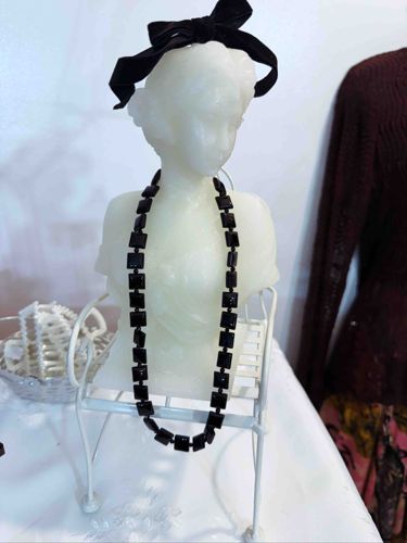 This elegant statement necklace consists of uniform square-shaped black onyx beads strung individually with round onyx spacer beads. Based on the provided context, the item features sterling silver components and a specialized onyx-inlaid clasp. The onyx displays a deep, consistent jet-black hue with a high-polish vitreous luster, characteristic of quality chalcedony. The geometric square beads reflect an Art Deco aesthetic, emphasizing clean lines and monochromatic contrast. The construction appears to be professional-grade, with the small spacer beads providing necessary flexibility for the drape. While the exact length is not specified, it is displayed as a matinee or opera length piece. The overall condition appears excellent with no visible chips or fractures to the stone edges. The sterling silver elements likely possess a hallmark, though not visible here. This piece likely dates from the late 20th century to contemporary, imitating early 20th-century mourning jewelry or high-fashion Deco motifs. The use of a matching onyx clasp indicates a higher level of artisanal craftsmanship and attention to detail than mass-produced costume jewelry.