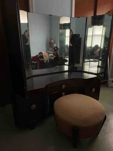 Red Lion Furniture Art Deco Polished Wood Vanity with Five-Panel Mirror and Matching Hassock