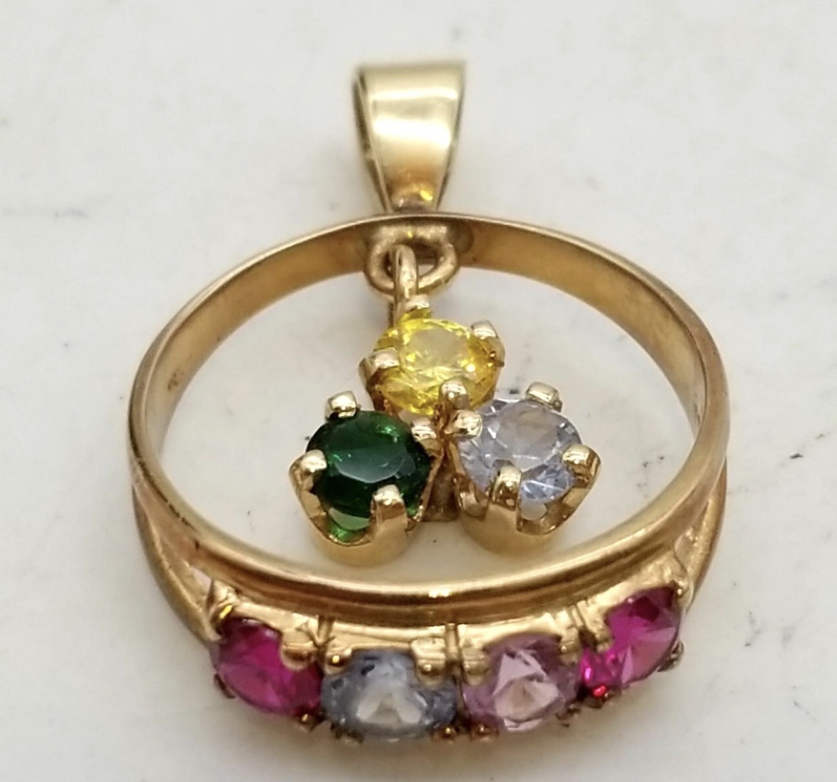 This is a yellow gold pendant designed to mimic the appearance of a birthstone 'Mother's Ring.' The item features a unique structure consisting of a fixed outer circular band set with four round-cut faceted gemstones in heavy four-prong mounts along the bottom arc. These gems include two shades of ruby-pink/red, a clear/white stone, and a pale pink stone. Suspended within the center of the ring loop by a small jump ring is a cluster of three additional round-cut faceted gemstones in a triangular formation: one yellow, one emerald green, and one clear/light blue. Based on the provided context, the metal is likely 10K or 14K yellow gold. The overall construction shows a polished finish with moderate surface wear, including minor scuffing and scratches on the metal surfaces consistent with regular use. The prongs appear secure, though there is visible dirt/residue accumulation around the gemstone settings, typical of vintage or pre-owned jewelry. The design reflects a late 20th-century aesthetic, common in personalized family jewelry styles from the 1980s to early 2000s. The mix of genuine semi-precious stones, lab-created gems, or crystals is frequent in this specific category of sentimental jewelry.