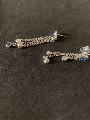 A pair of contemporary silver-tone drop earrings featuring a triple strand tassel design. Each earring is constructed with three fine-link cable chains of varying lengths attached to a central post setting. The earrings are accented with small bezel-set faceted crystals in two shades of blue—a darker cobalt and a lighter sapphire—along with polished spherical silver-tone beads that act as weights at the ends of the chains. The metal appears to be a plated base metal or sterling silver, possessing a bright, high-polish finish. They are designed for pierced ears and include plastic disc-style clutch backs for stability. The overall length is approximately two inches, providing significant movement when worn. The construction suggests an early 21st-century fashion jewelry style, likely mass-produced given the uniform machine-made chain and standard bezel settings. The condition is excellent with no visible tarnishing or missing stones, though some minor surface scratches on the metal beads are consistent with light handling. The craftsmanship is clean, indicating a reputable mid-tier fashion brand.