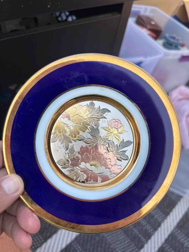 This is a decorative cabinet plate, likely of Japanese origin, featuring 'Chokin' metal engraving art at its center. The plate is constructed from fine white porcelain with a wide border of deep cobalt blue glaze and heavy 24k gold gilded rims. The central medallion is a metal disk, traditionally copper or brass plated with silver and gold, depicting an intricate floral motif of peonies. Peonies are classic motifs in Japanese art representing prosperity and honor. The metalwork displays high-quality craftsmanship with sub-circular etching and multi-tone metallic finishes including gold, silver, and rose-copper hues. Approximately 4 to 6 inches in diameter, the piece reflects a style popular in the late 20th century (circa 1970s-1990s) produced by companies like 'The Art of Chokin.' Condition-wise, the plate shows light surface wear and minor scuffing on the cobalt glaze, with some expected thinning of the gold gilding on the outer edge. The metal insert is well-secured and shows a light natural patina but no major oxidation. This piece serves as a commemorative or souvenir art object, bridging traditional metal engraving techniques with commercial porcelain manufacturing.