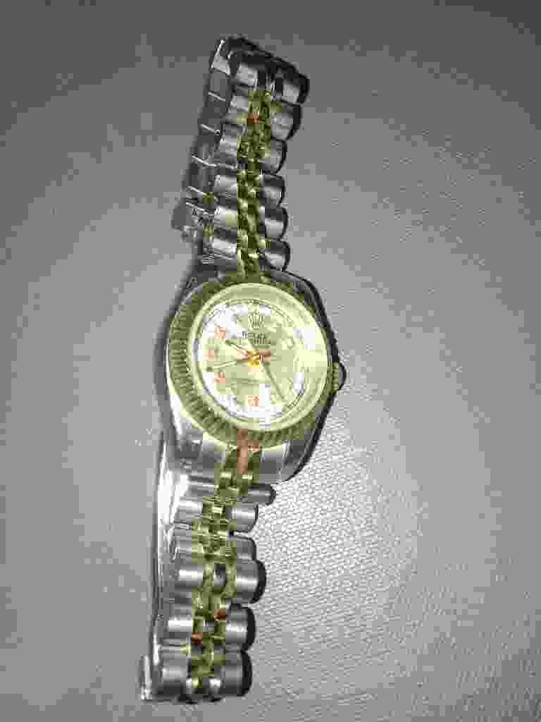 This is a two-tone wristwatch designed in the iconic style of a Rolex Oyster Perpetual Datejust. The timepiece features a round stainless steel case with a gold-tone fluted bezel, a hallmark design element that provides a classic and luxurious aesthetic. The light-colored champagne dial is marked with the recognizable five-point coronet logo at the 12 o'clock position and incorporates luminescent hands and Roman numeral hour markers. The watch is fitted with a two-tone Jubilee-style bracelet, characterized by its five-piece link construction with three rows of smaller, gold-colored central links flanked by larger brushed stainless steel links. The visible condition of the item raises significant concerns regarding authenticity and quality. There is noticeable 'stretch' or gapping in the bracelet links, suggesting heavy wear or the use of lower-quality metal alloys rather than solid gold and precision-milled steel. Significant discoloration is visible on the gold-toned central links, particularly at the friction points, where the gold plating appears to be wearing off to reveal a base metal underneath. The overall finish appears dull and lacks the sharp, high-polish transitions typical of luxury Swiss manufacturing. There is also a notable absence of the distinctive Cyclops lens (magnifying crystal) over the date window, which is a standard feature for this specific style. Given the inconsistent finishing and the visible wear on the plating, this item appears to be a lower-end fashion watch or an imitation piece rather than a genuine high-end luxury timepiece.
