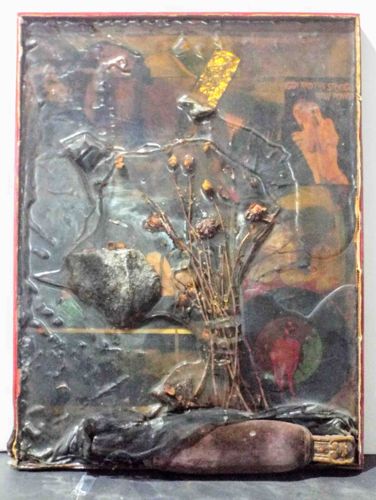 This is an original untitled mixed-media assemblage or shadow box creation by an unidentified contemporary artist. The work is constructed within a rectangular frame or box, featuring a heavily textured and layered composition. Central to the piece is a bouquet of dried flora, including what appear to be small rosebuds or thistles, encased behind a clear, wavy epoxy or resin pour that gives the surface an organic, rippled texture. The background incorporates found imagery, including a golden rectangular foil elements, a faint figure in an orange/nude tone on the right, and a circular red-and-green graphic element near the bottom right. A large, dark, organic shape—possibly a stone or heavy wad of cloth—is adhered to the left side, while the bottom of the frame is anchored by a thick, purplish-brown tubular object resembling a seed pod or leather pouch. The color palette is dark and somber, dominated by deep grays, blacks, and browns, contrasted against pops of gold leaf and muted reds. The craftsmanship is expressive and visceral, typical of mid-to-late 20th-century or 21st-century assemblage art. Condition shows deliberate distressing, though some edge wear on the red frame and dust accumulation within the resin crevices are visible.