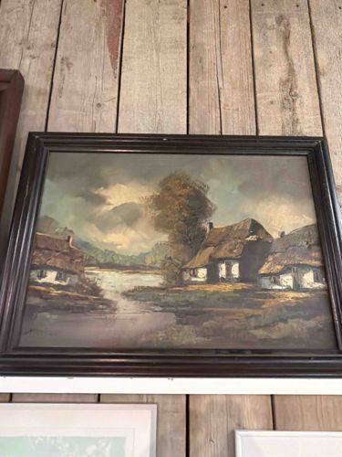 This item is a mid-to-late 20th-century landscape painting, likely oil or acrylic on board or canvas, depicting a tranquil rural scene with several thatched-roof cottages near a calm body of water. The composition is grounded in earthy tones—deep browns, olives, and muted ochres—contrasted by a dramatic, moody sky with swirling white and gray clouds suggesting an impending storm or early dusk. The technique appears to be expressive with visible impasto or textured brushwork, particularly in the foliage of the central tree and the thatched roofs, indicating a post-Impressionist or mid-Century decorative style. The painting is housed in a substantial, dark-stained wooden frame with a classic molded profile featuring several distinct ridges and a deep cove. Regarding condition, the frame shows some visible scuffs and minor nicks along the upper and left edges, consistent with age. The painting surface appears generally stable, though some slight discoloration or 'yellowing' of the varnish may be present. No prominent artist signature is immediately visible in the provided image, suggesting this may be a commercial or studio work popular for home decor during the 1960s-1980s. The overall aesthetic leans toward European pastoral romanticism, capturing a sense of rustic charm and nostalgia.