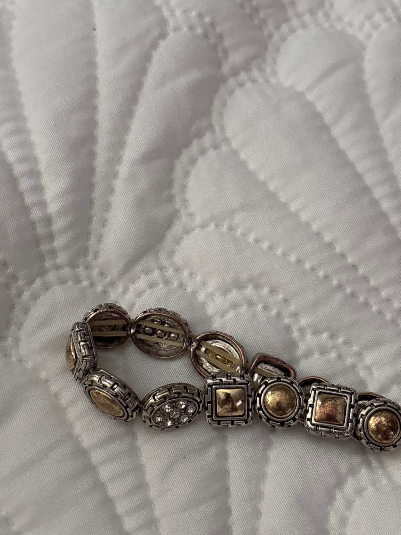 This is a contemporary fashion stretch bracelet featuring a sequence of alternating geometric links. The piece is constructed from a base metal, likely pewter or a similar alloy, with a distressed silver-tone finish and contrasting gold-tone / brass-toned accents. The links alternate between circular, oval, and square shapes, each embellished with intricate textured borders and milgrain detailing. Notable features include a specific oval link pavé-set with small clear crystals (likely rhinestones or glass) and various links with domed or pyramidal metallic centers. The construction utilizes a dual elastic cord system visible from the interior, allowing for a flexible, one-size-fits-most fit. Condition-wise, the bracelet shows signs of moderate wear and aged patina; there is significant visible oxidation and rubbing on the gold-tone surfaces, revealing a deeper copper-toned base or tarnish underneath. The silver-toning also exhibits darkening in the recesses, which may be intentional for a vintage aesthetic or a result of surface contamination. No specific maker's marks are visible in the provided view, but the style is consistent with late 20th-century to early 21st-century costume jewelry mass-marketed by brands such as Brighton or similar boutique labels focused on eclectic, artisanal-style designs.