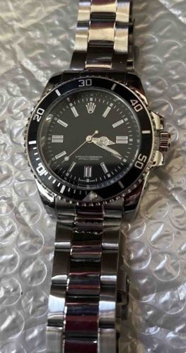 This item is a replica or counterfeit wristwatch designed to mimic the appearance of a Rolex Submariner. The timepiece features a stainless steel case approximately 40mm in diameter, paired with a three-link oyster-style bracelet with polished center links. It utilizes a black dial with applied baton and rectangular hour markers, notably lacking the standard geometric shapes (circles and triangles) found on authentic models. The dial displays a Rolex crown logo and 'Superlative Chronometer' text, but the quality of the printing and alignment is poor. The unidirectional rotating bezel is black with silver-toned Arabic numerals, but it shows significant alignment issues and lack of depth in the engraving. Visible condition issues include heavy surface scratches on the metal, chrome-like plating wear on the crown, and a noticeable lack of high-end finishing. The craftsmanship is low-quality, as evidenced by the uneven gaps between the end links and the case, as well as the incorrect hand shapes for this specific model line. The overall construction suggests a low-cost mass-produced imitation rather than a genuine Swiss luxury watch.