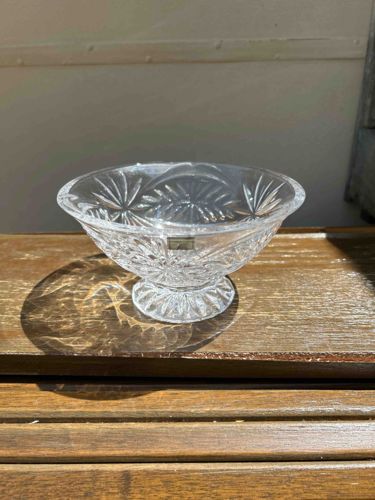 This is a fine footed crystal bowl manufactured by Tipperary Crystal, a renowned Irish design brand. The piece is crafted from high-quality clear lead crystal, characterized by its substantial weight, clarity, and brilliant refractive properties as evidenced by the sharp light patterns cast in the shadows. The bowl features a classic flared rim and is decorated with an intricate cut-glass pattern consisting of several repeating 12-point star-burst or sunburst motifs separated by vertical wedge cuts. The pedestal base is similarly faceted with radial cuts to provide a unified aesthetic from top to bottom. A small, rectangular metallic sticker is visible on the side of the bowl, identifying the maker as Tipperary Crystal. The construction shows high-level craftsmanship with deep, precise geometric cuts that catch and disperse light efficiently. Based on the style and branding, this piece likely dates from the late 20th century to modern day. The condition appears to be excellent with no visible chips, cracks, or clouding; the edges of the facets remain sharp, indicating minimal wear or handling. The item displays the distinct 'water-white' transparency associated with premium Irish crystal products.