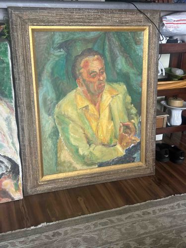 This is a large-format expressionist oil portrait on canvas, depicting a middle-aged man in a seated position. The subject is styled in mid-century attire, specifically a pale green blazer worn over a vibrant cadmium yellow shirt with a wide, dramatic collar consistent with 1940s-1950s fashion. The painting technique is characterized by heavy, visible impasto and a bold use of color; the background consists of swirling teal and emerald tones that suggest a draped fabric or interior space. The flesh tones are rendered with a complex palette including ochre, terra cotta, and hints of green, reflecting a modernist approach to light and shadow. The piece is housed in a substantial wooden frame featuring a rustic, gray-washed textured finish with a gold-leafed inner fillet. Dimensions appear approximately 24x36 inches based on surrounding interior context. The condition shows light frame scuffing and minor dust buildup on the textured paint surface, but the canvas appears taut without significant cracking or loss. While a signature is not clearly visible in the provided image, the vigorous brushwork and confident color palette indicate a skilled hand, possibly an artist from the mid-20th-century New York School or a similar regional modernist movement.