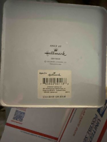 This is a base-up view of a square-shaped commemorative or gift tin manufactured for Hallmark. The item is constructed from lightweight sheet metal, finished in a semi-glossy white or off-white enamel coating. The underside features the 'ONLY AT Hallmark' crown logo and secondary branding, alongside a serial or model number (129YX429) and a 'Made in China' designation. The bottom also retains its original adhesive retail sticker, which includes a barcode (7 95902 39118 8), the 'Ages 3+' safety rating, the Hallmark Licensing LLC copyright, and a MSRP of U.S.A. $24.95 / CAN $29.99. Based on the copyright and manufacturing style, the item likely dates from the 2010s. The physical condition appears excellent with minimal signs of shelf wear; the edges show crisp registration with no visible denting, oxidation, or significant scuffing. The application of the paper sticker remains well-centered, though it shows slight discoloration consistent with age. Such tins were frequently used for seasonal offerings, specifically for high-end ornaments or small plush collectibles exclusively sold through Hallmark Gold Crown stores. The quality of the lithography on the branding is sharp, indicating standard mass-production techniques for branded giftware.