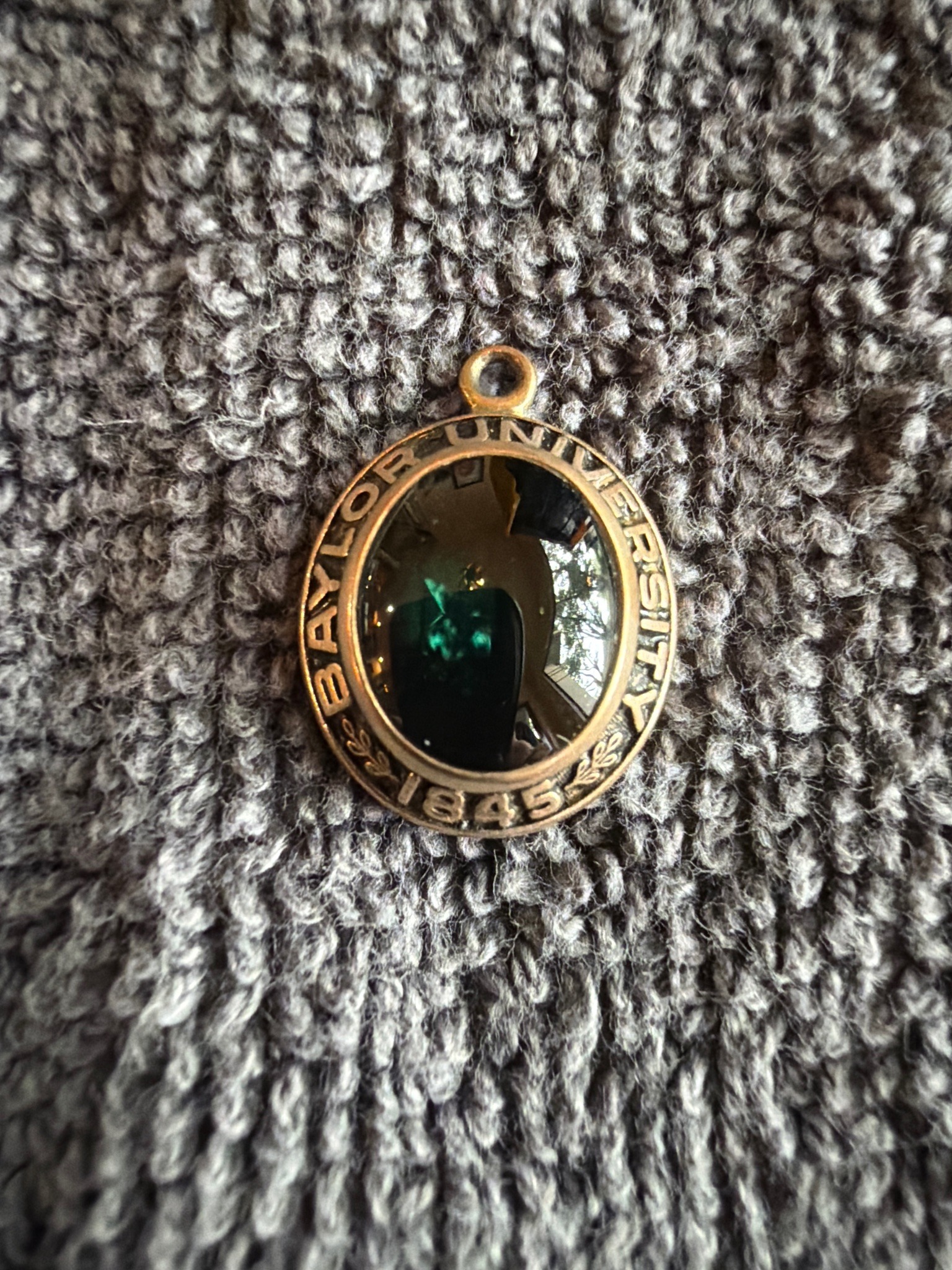 This is an oval-shaped collegiate pendant for Baylor University, featuring a central bezel-set stone that transitions from deep green to black, suggestive of common school colors and typical class jewelry stones. The pendant is constructed from what appears to be yellow gold, according to the user context. The outer border features embossed capital lettering reading 'BAYLOR UNIVERSITY' along the top and sides, with the university's founding year '1845' at the bottom. Small decorative floral or laurel sprigs act as separators between the text and numerals. The metal surface shows an aged patina with darkened oxidization in the recessed areas of the lettering and design, which adds depth and identifies it as a vintage piece. The stone is a polished cabochon with a high-gloss finish, reflecting the surrounding environment. At the very top, there is a small circular integral bail used for attaching a chain. The overall craftsmanship reflects mid-to-late 20th-century jewelry manufacturing common for university memorabilia. There are some minor surface scratches on the metal consistent with age and wear, but the piece overall appears to be in good structural condition without major damage or visible repairs.