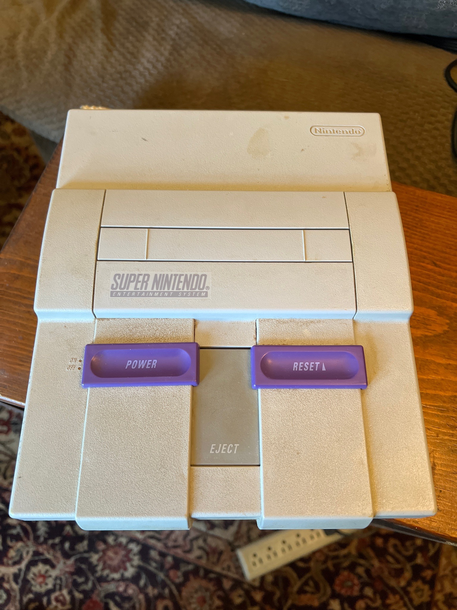 This is a classic 16-bit video game console, specifically the North American version of the Super Nintendo Entertainment System (SNES), released in 1991. The unit is constructed from molded ABS plastic featuring a two-tone gray top shell with iconic purple slide switches for 'Power' and 'Reset,' and a dark gray 'Eject' lever. The console features a top-loading cartridge slot protected by dual flaps. Physically, the device shows signs of moderate age-related wear, including several brown surface stains on the top lid and dust accumulation within the crevices. Notably, this unit displays minimal 'yellowing' (retrhobrighting), which is common in older SNES units due to bromine flame retardants in the plastic reacting with UV light. The front face bears the crisp 'Super Nintendo Entertainment System' logo in classic purple slab-serif typography. The Nintendo brand is embossed in an oval on the upper right rear. As a first-edition model (SNS-001), it represents the peak of early 90s industrial design in home electronics, known for its durable internal circuitry and proprietary controller ports located on the front panel. The unit appears original with no visible modifications, representing a historically significant artifact of the fourth generation of gaming consoles.