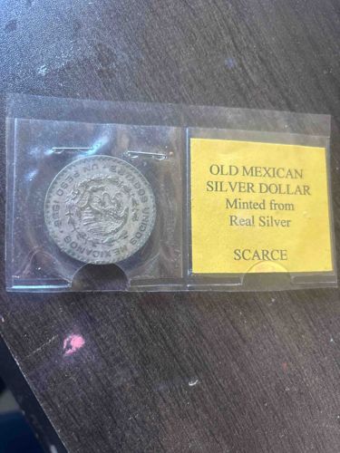 This item is a 1958 Mexican Un Peso silver coin, commonly referred to as the 'Morelos' Peso due to the portrait of Jose Maria Morelos on the obverse. The visible side in the image shows the Mexican national coat of arms—an eagle perched on a cactus devouring a snake—surrounded by the text 'ESTADOS UNIDOS MEXICANOS' and 'UN PESO 1958'. Physically, these coins are composed of a silver alloy, specifically 0.100 (10%) fineness, which was a significantly lower silver content than previous eras. The coin appears to be in circulated condition with visible surface wear, dulling of the original luster, and significant dark grey-to-black toning or tarnish typical of low-grade silver. It is housed in a contemporary clear plastic sleeve with a yellow paper insert that reads 'OLD MEXICAN SILVER DOLLAR Minted from Real Silver SCARCE'. This marketing insert is likely from a third-party distributor or souvenir seller rather than a formal numismatic grading service. Despite the insert's claim of being 'scarce', these coins were minted in high volumes during the late 1950s. The craftsmanship reflects mid-20th-century industrial minting techniques, with a reeded edge and machine-struck details that show flattening on the higher points of the eagle design due to use.