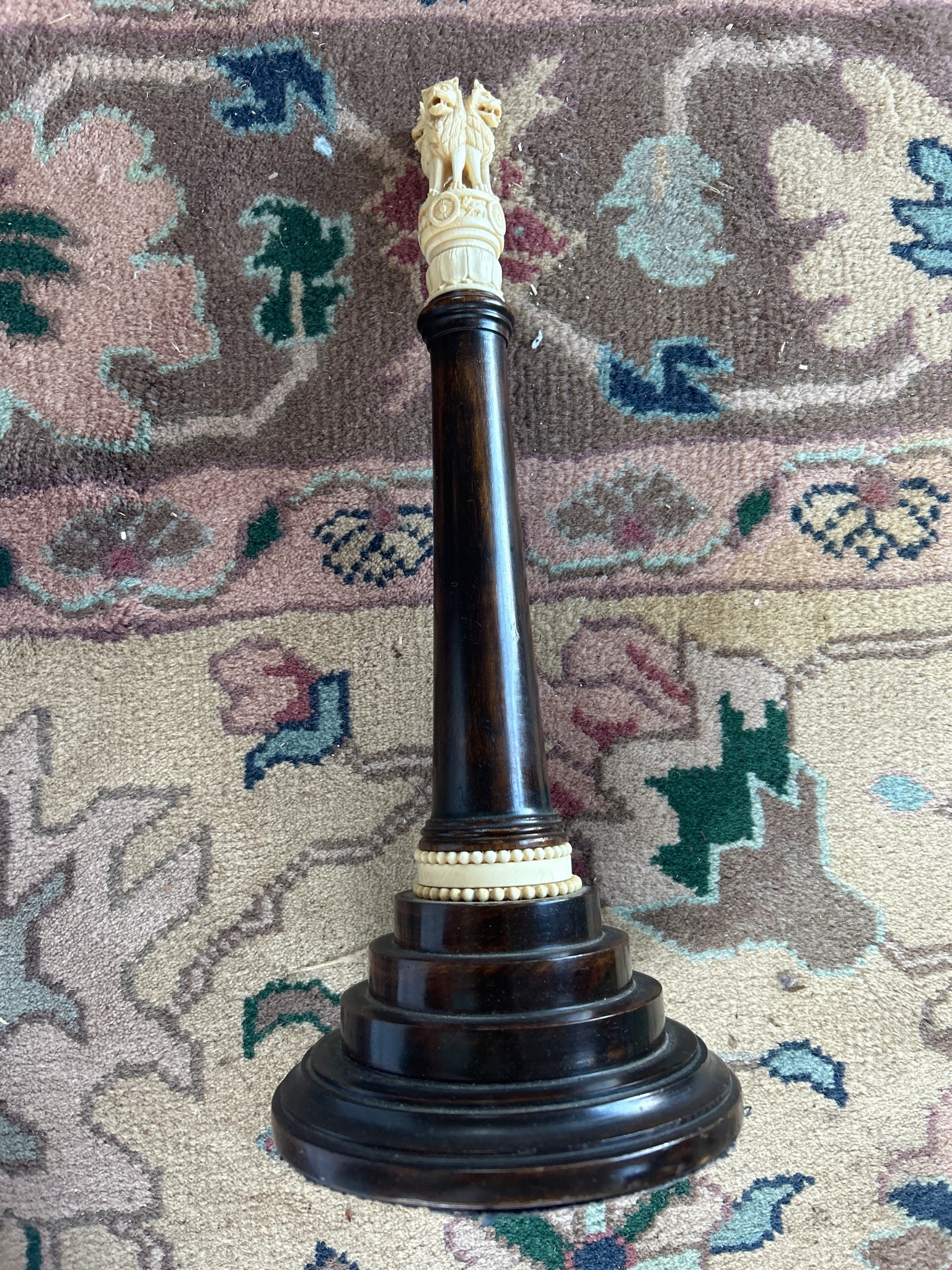 This is a decorative pedestal or candle holder featuring a finely carved finial resembling the Lion Capital of Ashoka, the national emblem of India. The piece stands on a stepped circular base made of a dark-stained, polished hardwood, likely rosewood or ebony-finished sheesham. The central shaft is tapered and smooth, transitioning into a decorative collar featuring two rows of cream-colored beaded or 'pearl' inlay, which appears to be carved bone or a synthetic ivory substitute. The crowning element is a highly detailed cream-colored carving of four lions standing back-to-back on an abacus that includes a frieze carrying sculptures in high relief of an elephant, a galloping horse, a bull, and a lion, separated by intervening chariot wheels. The piece shows signs of mid-to-late 20th-century craftsmanship typical of high-end Indian souvenir or export ware. The condition appears excellent with a rich, glossy patina on the wood and no visible cracks or losses to the delicate carvings at the top. The joinery between the wood and the carved elements is tight, suggesting quality artisanal construction. The overall aesthetic combines traditional Indian imperial iconography with British colonial-style wood turning.