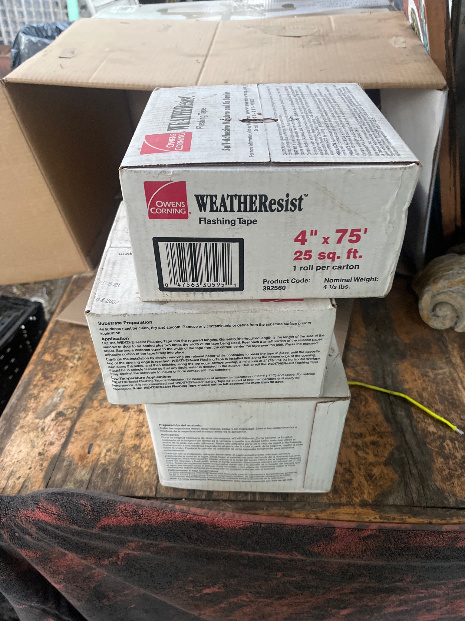 This item consists of three original cardboard packaging units for Owens Corning WEATHEResist Self-Adhesive Moisture and Air Barrier Flashing Tape. The boxes are constructed from standard white corrugated cardboard with red and black printed graphics and text. Each carton is designed to house a single roll of tape measuring 4 inches by 75 feet, totaling 25 square feet of material with a nominal weight of 4 1/2 lbs. The packaging features the prominent Owens Corning logo and product branding, along with technical specifications, a UPC barcode (0 47563 30595 1), and product code 392560. The sides of the boxes provide detailed application instructions in both English and Spanish, including substrate preparation and temperature limitations. This specific batch shows signs of storage wear, including crushed corners, surface soiling, and minor tearing to the cardboard flaps, particularly on the top unit. Date stamps and batch numbers are visible on the side of the middle box, suggesting a mid-2000s manufacturing era. This is a industrial-grade building material used for sealing windows and doors against moisture infiltration.