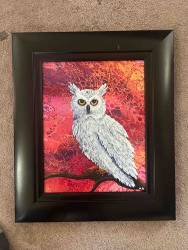 This contemporary 11 x 17 inch framed artwork is a mixed media composition by artist Heather Dixon, featuring a central subject of a Great Horned Owl or Snowy Owl variant perched on a dark branch. The piece demonstrates a high level of craftsmanship through its multi-layered approach. The background utilizes a fluid art or acrylic pour technique, resulting in complex cellular structures and marbling in vibrant shades of magenta, crimson, and golden orange. This serves as a high-contrast backdrop for the owl, which appears to be applied with more traditional brushwork, creating a textured, almost impasto effect on the white and gray plumage. The owl's eyes are rendered in a striking yellow-orange with high-gloss detail, providing a focal point for the viewer. The artist's initials 'H.D.' are visible in the lower right-hand corner in white script. The condition appears to be excellent for a new contemporary work, with the surface showing no signs of fading, cracking, or pigment loss. The painting is housed in a modern, professional step-coved black matte frame with a slight luster, which complements the bold color palette of the interior artwork. The frame is wide-profile and structurally sound with clean mitered corners and minimal visible wear.