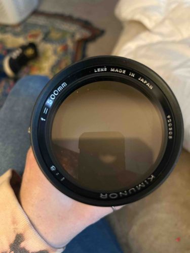 The item is a vintage telephoto camera lens, specifically a 'Kimunor f=500mm 1:8' model, which is an unusually long focal length lens designed for specialized photography such as sports, wildlife, or astronomical observation. The lens appears to be constructed primarily from metal, likely an aluminum alloy, given its black matte finish. The front element of the lens is visible, exhibiting a subtle brownish or amber tint, which could be an anti-reflective coating or a pre-existing filter. The lens barrel features white engraved or printed markings indicating its specifications: 'f=500mm' denoting the focal length, and '1:8' indicating its maximum aperture. The brand name 'KIMUNOR' is prominently displayed around the front rim. Additionally, the phrase 'LENS MADE IN JAPAN' is visible, confirming its country of manufacture. There is also a partial serial number '920308' visible on the right side of the lens rim. The overall condition appears to be good for a vintage item, with no obvious major damage like dents or deep scratches to the barrel visible in the image. However, a detailed inspection of the glass elements for dust, fungus, scratches, or delamination would be necessary for a full appraisal. The lens has a robust, classic design typical of manual focus photographic equipment from the mid to late 20th century. Its considerable length suggests it would be a substantial piece of equipment, likely requiring a sturdy tripod for stable use.